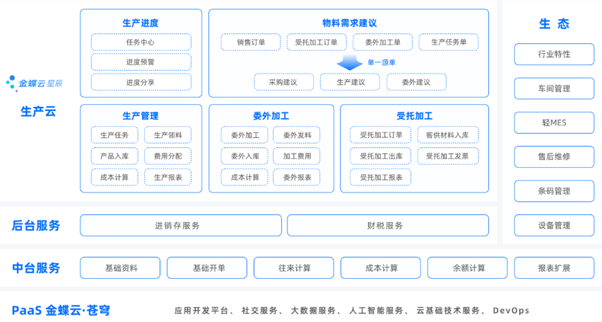 金蝶云·星辰生产云面向小型工贸企业的生产、仓库、财务、采购等管理人员,提供以销售订单为源头的全业务流程的数字化管控。支持从销售管理、采购管理、生产管理、委外管理、库存管理和财务管理帮助小型工贸企业有效地掌握各个环节的活动信息,掌握生产进度,提高生产效率,降低材料损耗和生产成本,综合提升产品交付率,使得客户对企业有更高的满意度