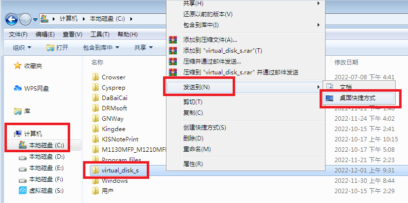 4、桌面创建快捷方式 点【计算机或我的电脑】--【C盘】--【virtual_disk_s】 右键 发送到-桌面快捷方式