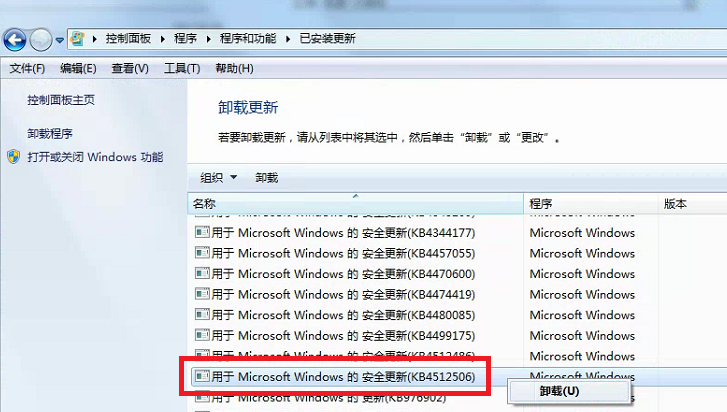 打开控制面板→程序和功能→查看已安装的更新→Microsoft Windows 将【出现问题的补丁】卸载掉,再重启电脑;