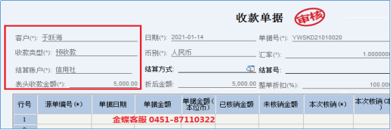 选择客户,选择结算账户,输入表头收款金额,保存并审核