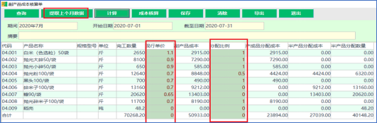 (1)【副产成品成本核算】 1、点查询 2、点提取上个月数据,把现行单价自动带出,根据实际价格修改现行单价、分配比例(0代表副产品生产过程产生的副产品,1代表产成品生成过程产生的副产品,0.5代表同时产生的副产品) 3、 点计算 4、点保存、 5、点成本核算 6、账务处理-- 做账副产品摊销凭证,金额到成本核算--副产品成本核算查询