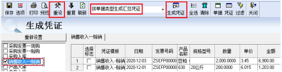 选择【销售收入--赊销】→【重设】→【汇总生成凭证】→【生成凭证】