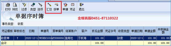 选择【收款单】/【预收款】进入单据序时簿 ,按Ctrl或Shift选多条收款单 点【汇总】或【按单】