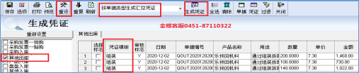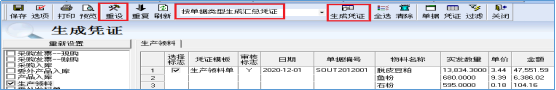选择【生产领料单】→【重设】→【按单据类型生成凭证】→【生成凭证】