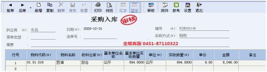 1、【仓存管理】→【采购入库】,打开采购入库单编辑界面,录入数据后点击【保存】→【审核】