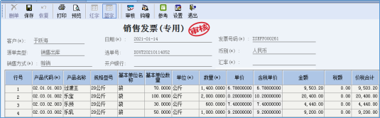 2、销售发票界面,录入税率,自动算出含税单价、税额、价税合计 ,对销售发票审核勾稽