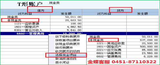(1)【总账】→【现金流量】→【T形账户】,过滤条件,选择期间范围