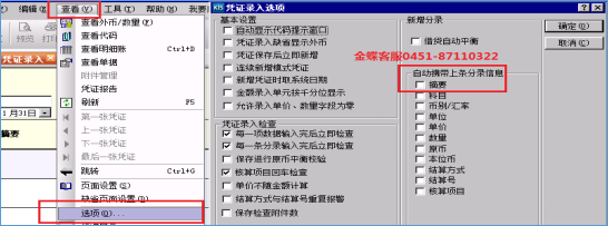 自动携带上条分录信息 | 在凭证录入的过程中,按向下[¯]或[Enter]键可以自动将上条分录的相关信息复制下来, 以提高凭证的录入速度。 |