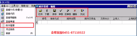 附件管理功能实现了将原始单据扫描进电脑以附件形式存储的功能。在“凭证录入”界面,凭证保存后,选择〖查看〗—>〖附件管理〗,