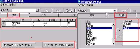 1、条件:字段选择会计年度、期间等;排序:按会计年度、期间、凭证号排序
