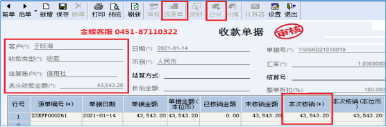 (1)选择核算项目,点【源单类型】,选择先手发票,源单编号按F7,选择收款单据,按Ctrl或Shift可选多条【收款源单】,点【返回】