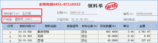 单据体:物料代码、发料仓库、实发数量、产成品(本次领料要生产的成本对象)