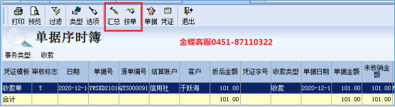 选择【收款单】/【预收款】进入单据序时簿 ,按Ctrl或Shift选多条收款单 点【汇总】或【按单】
