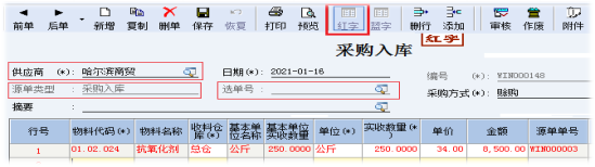 2、如果是采购退货,要编制【红字外购入库单】,单击工具栏上的【红字】,此时单据体中所有信息