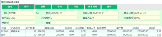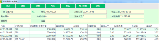 (3)【产成品成本核算】1、点查询 ,共耗材料、直接人工没有数据输入0 ,2、点计算,检查期间是否正确,与仓存管理--生产领料汇总表对下直接材料和包装物金额,与账务处理科--目余额表对下制造费用,看下副产品是否有金额 3、点保存4、点成本核算