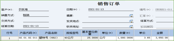 1、【供应链】→【销售管理】→【销售订单】→【销售订单新增】,打开销售订单编辑界面,录入并审核