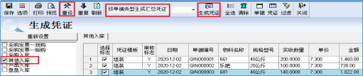 选择【其他入库】→【重设】→【按单据类型生成凭证】→【生成凭证】