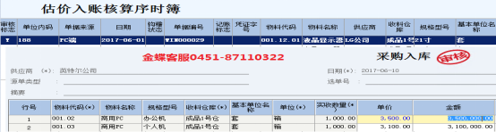录入过滤条件,选择需估价的单据,单击【确定】,显示“估计入账核素序时簿”,双击某一行,弹出该行所对应的单据,用户可录入单价,系统计算出金额,或录入金额,由系统倒算出单价。