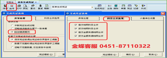 异常处理:选〖保存凭证前调出凭证修改界面手工调整〗,科目合并选项:全部选择合并